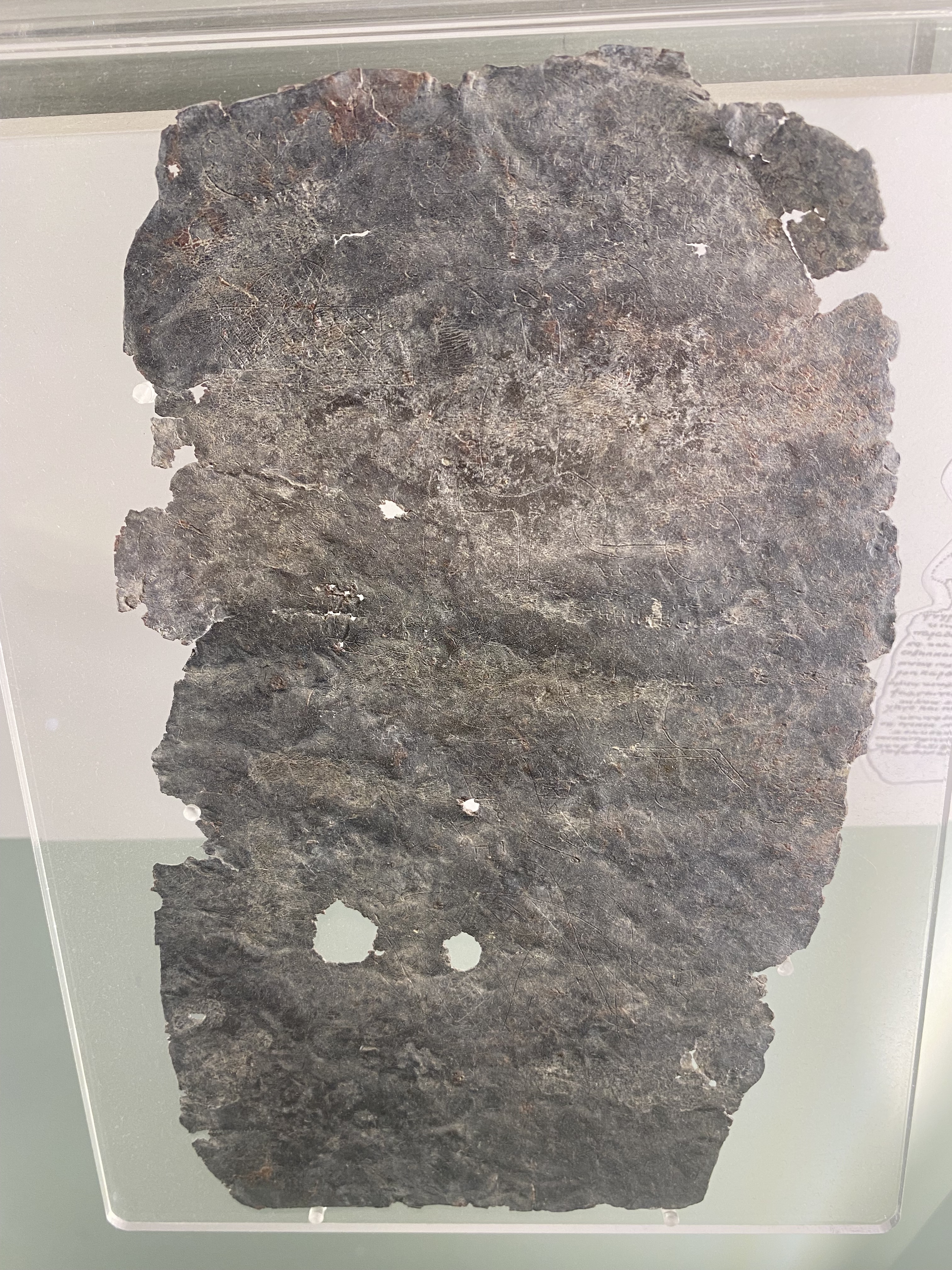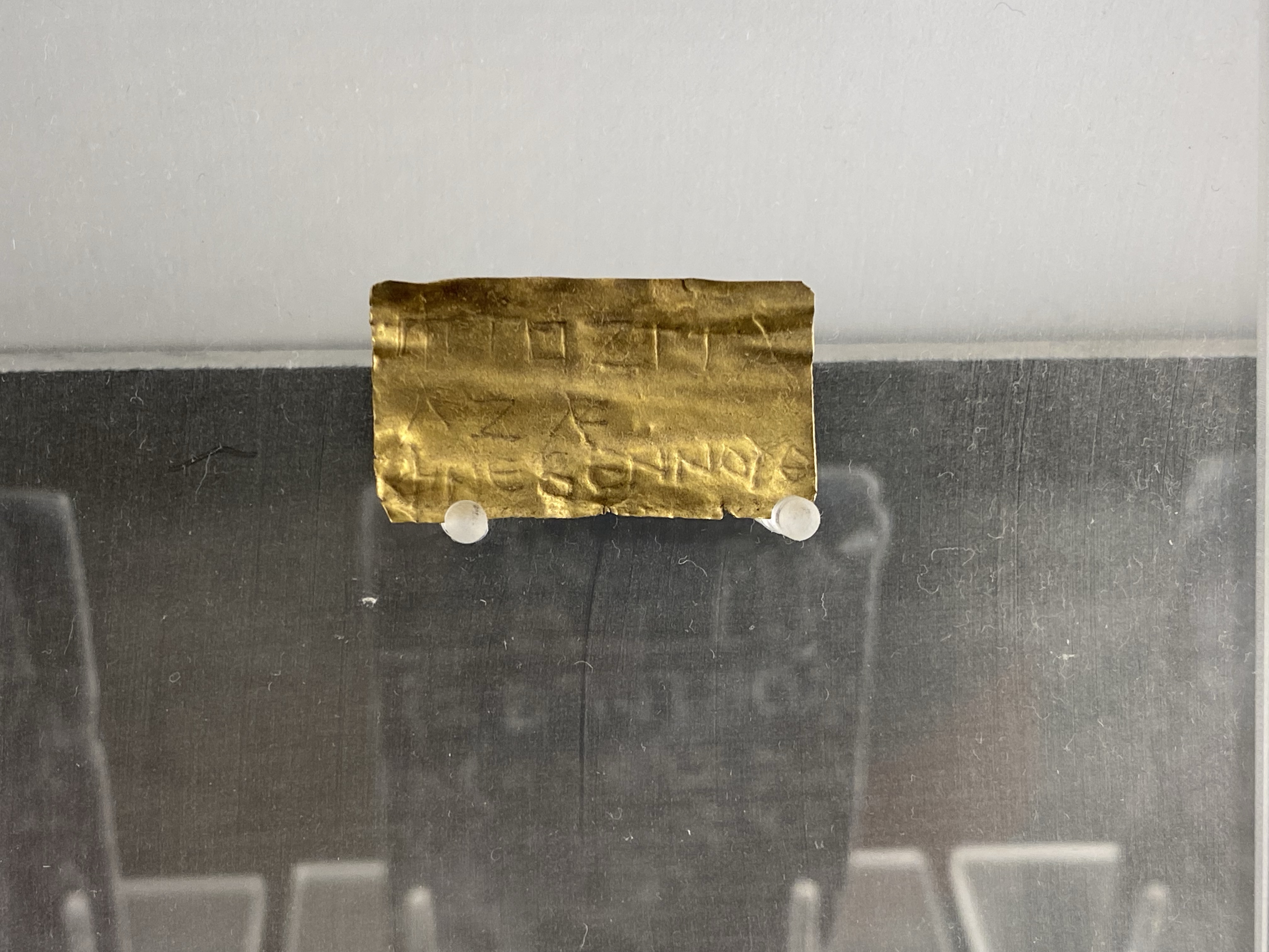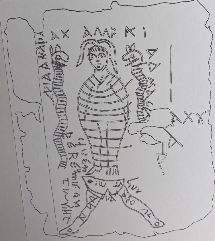 L’altra laminetta è coperta di segni magici; tra questi compare anche il tetragramma biblico, la sequenza delle quattro lettere ebraiche che compongono il nome di Jahwe.