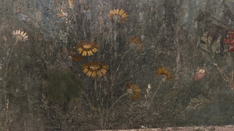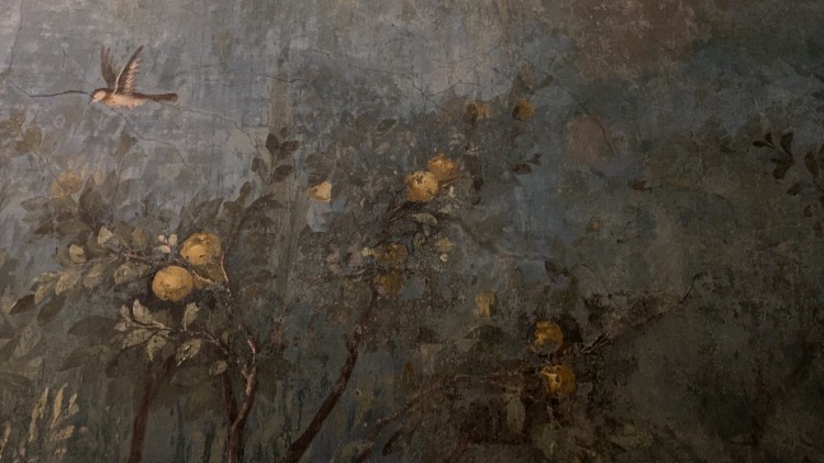 La parete viene dunque contraddetta, anzi negata, nello spazio magico dell’incanto pittorico e invita ancora oggi l’osservatore a sentirsi, mentre il vento piega le cime animate da volatili, nel bel mezzo del locus amoenus per eccellenza: il giardino.