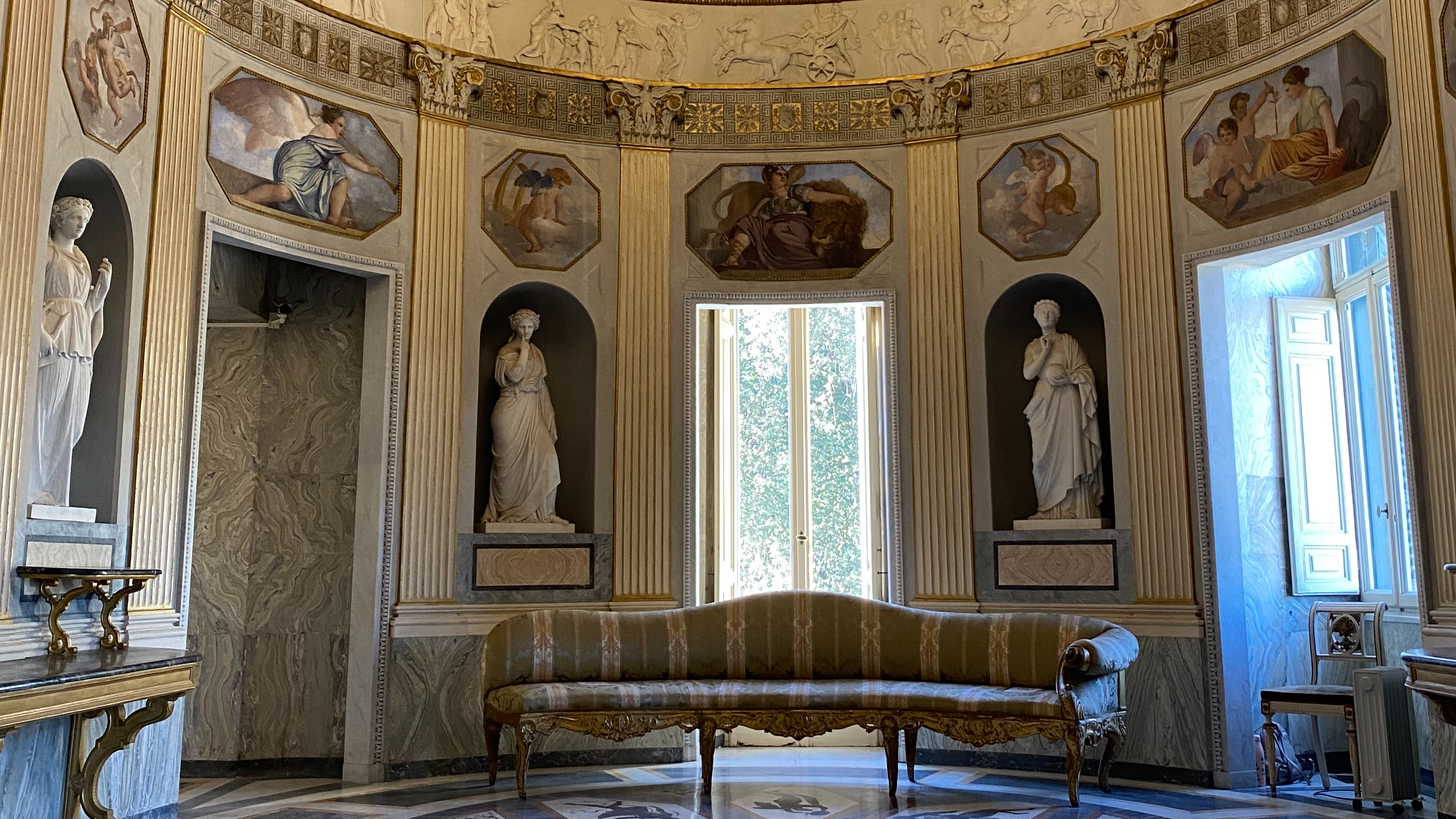 È il nucleo centrale dell’edificio, attorno al quale sono disposte le varie stanze e in altezza comprende due piani.Giovan Battista Caretti (1808-1878), nel suo intervento, conservò l’impianto architettonico dato da Giuseppe Valadier (1762-1839) alterando però completamente l’atmosfera sobria e luminosa dell’ambiente.Dipinti, stucchi, dorature e marmi disseminati su tutte le superfici hanno riempito la spazialità della…
