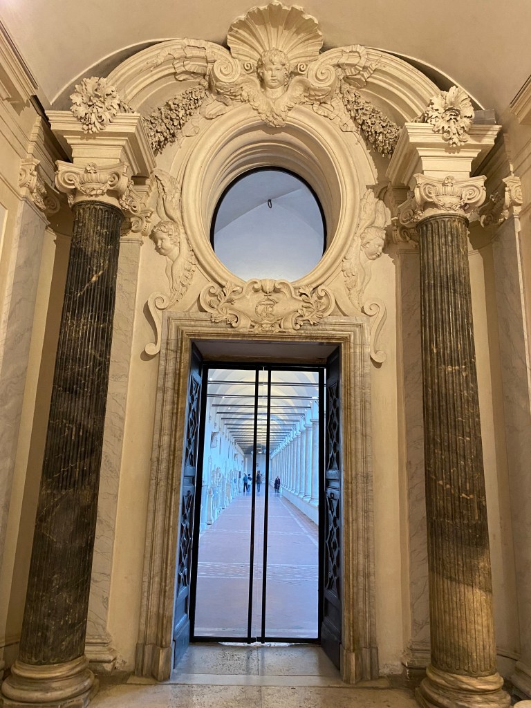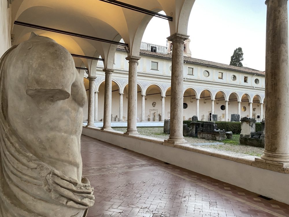 Uscendo dall’androne si entra nel chiostro dell’antica certosa, tradizionalmente attribuito al Buonarroti perché a lui fu affidato nel 1561 il compito di trasformare il frigidarium delle Terme di Diocleziano in chiesa.