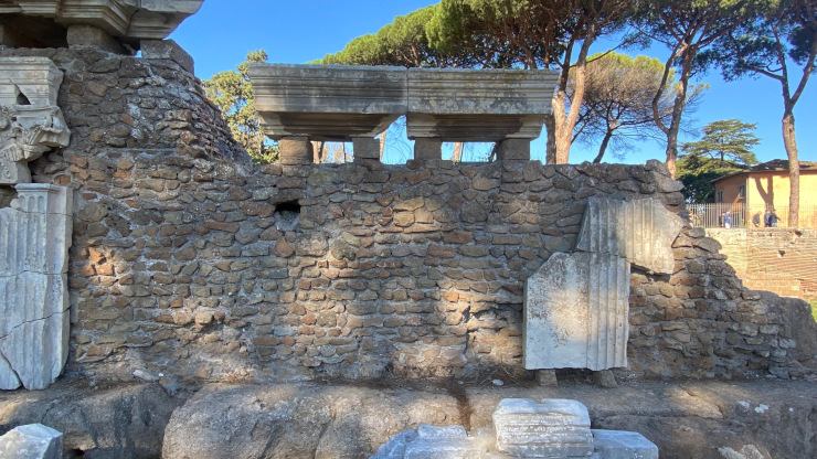 L’ingresso in città dalla Via Ostiense avveniva attraverso la Porta c.d. Romana, costituita da due vani, il cui livello originario era molto più basso dell’attuale.