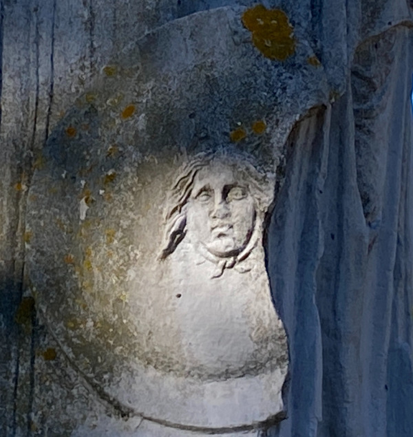La muratura in blocchi di tufo della porta era rivestita da una decorazione marmorea, ancora oggi in parte conservata.