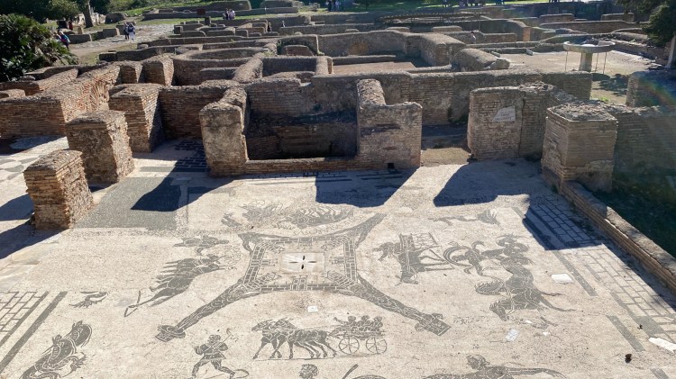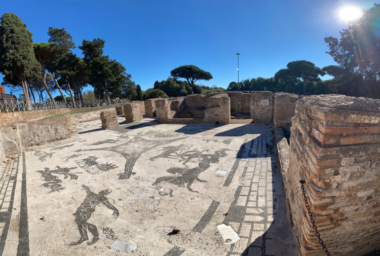 La parte nord era occupata dal frigidarium (sala per i bagni freddi), di cui si conserva l’originario pavimento in mosaico con raffigurazione di due cerchie murarie, all’interno delle quali si svolgono scene marine e scene di vita dei carrettieri.
