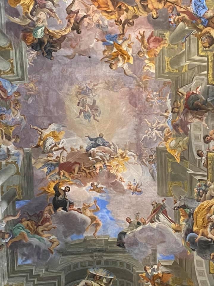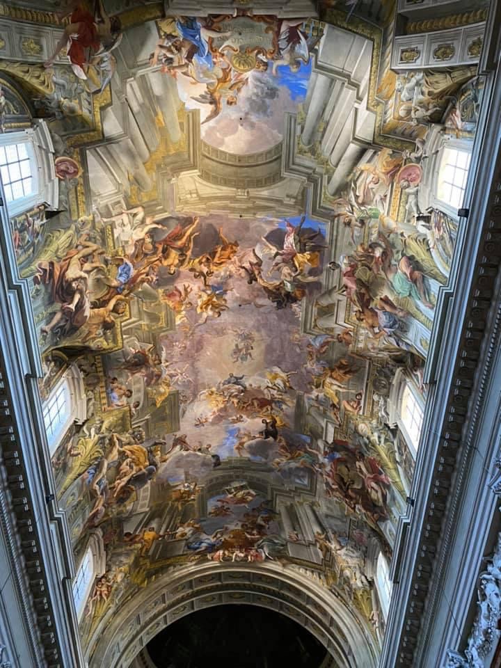Tra il 1691 e il 1695, il gesuita e artista Andrea Pozzo impiegò solo tre anni per dipingere la magnifica volta della chiesa. Utilizzando la tecnica dell’illusionismo prospettico, creò l’impressione che il soffitto sia alto il doppio della sua reale altezza. Camminando lungo la navata, i visitatori provano la sensazione che le figure dipinte sul soffitto li accompagnino in volo, sospese tra cielo e terra.
