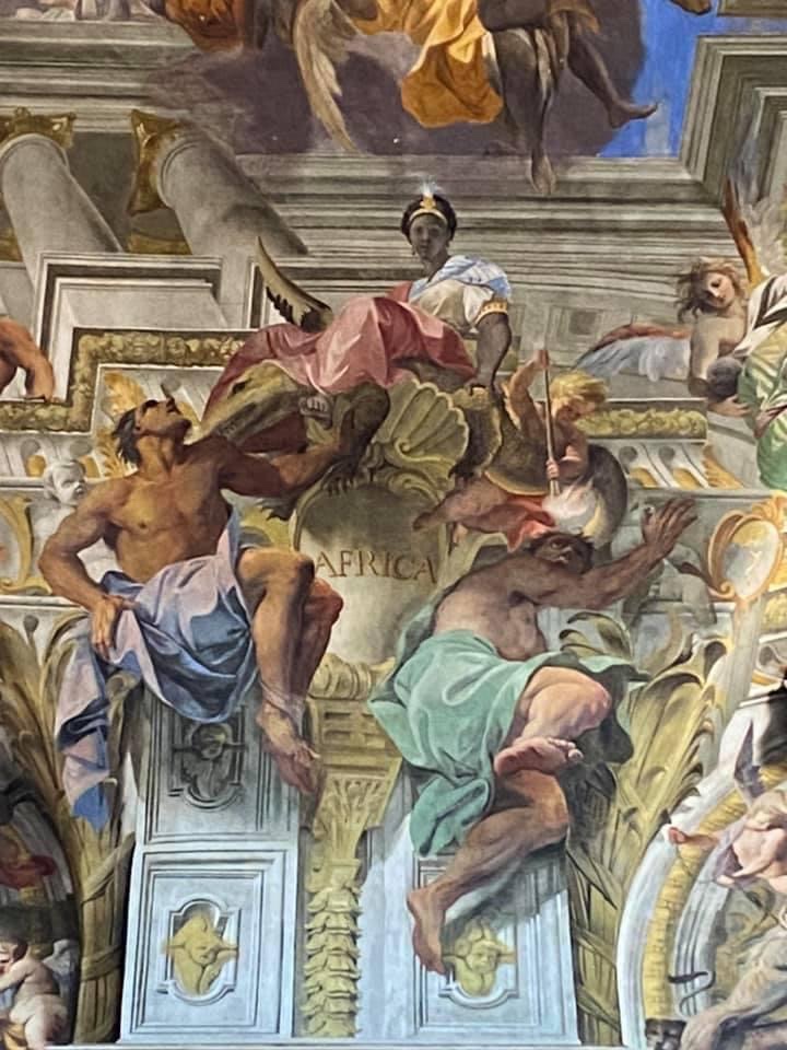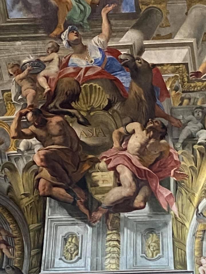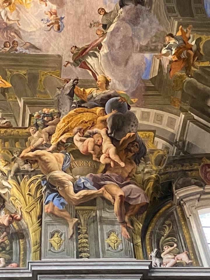 Al centro della volta, Sant’Ignazio riceve la luce divina da Cristo e la riflette verso i quattro continenti conosciuti all’epoca: Europa, Africa, Asia e America. Una composizione di straordinaria bellezza che esprime il desiderio di evangelizzazione globale dell’ordine gesuita.