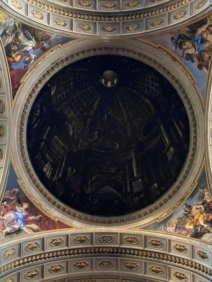 Proseguendo lungo la navata, il visitatore scopre un secondo sorprendente inganno visivo: la cupola… che in realtà non esiste! Si tratta di un perfetto trompe l’oeil, una tela dipinta con maestria per simulare una cupola tridimensionale. L’illusione si svela solo quando ci si trova direttamente sotto, lasciando chi guarda senza fiato.
