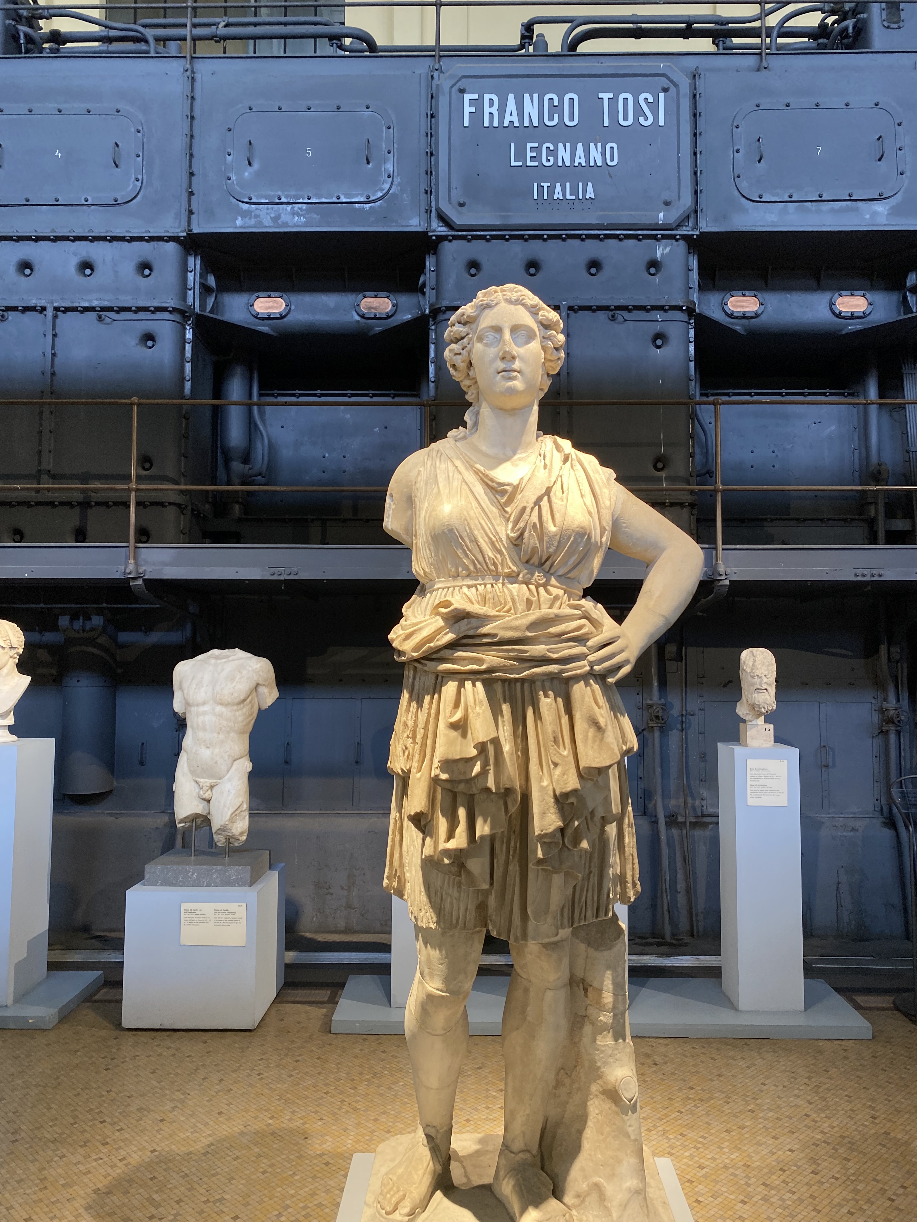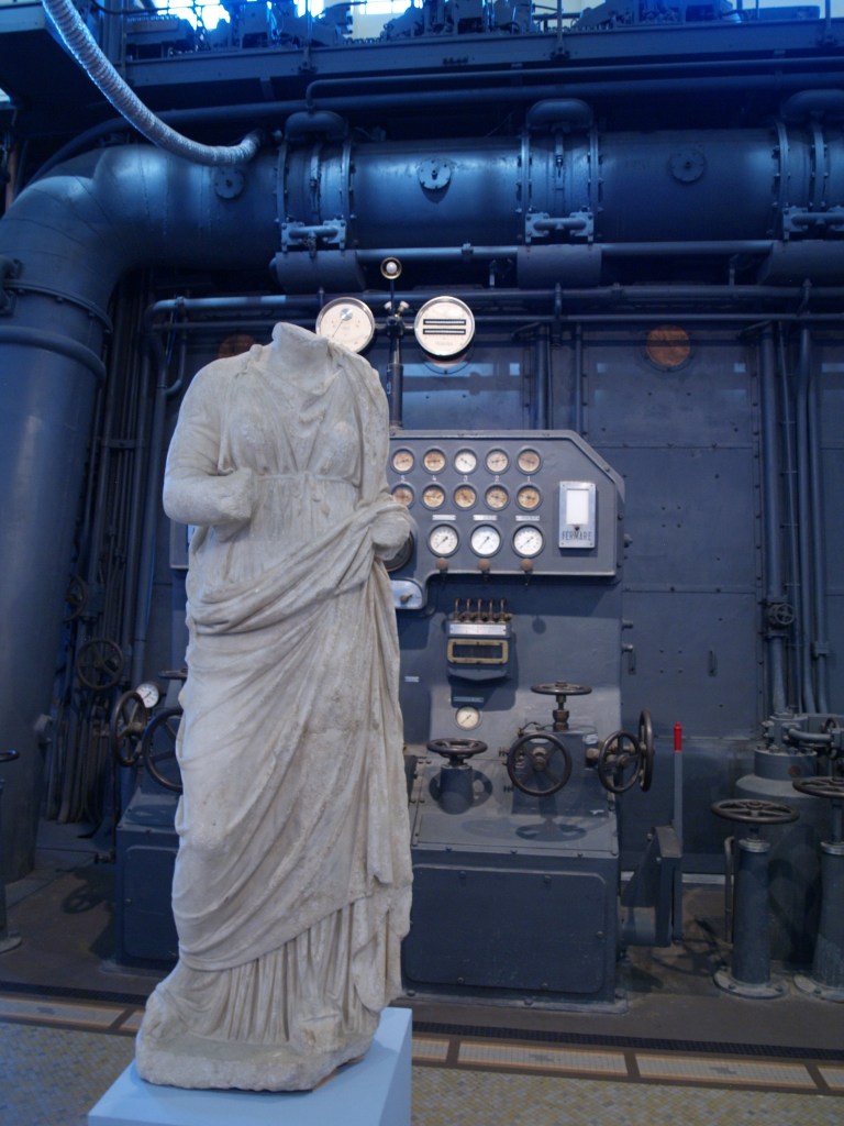 Se ci si inoltra al di là di un anonimo cancello sulla via Ostiense, si “scopre” la facciata monumentale della Centrale Montemartini inquadrata da due lampioni di Duilio Cambellotti, simbolo storico dell’illuminazione della città, e si intravede il grandioso ambiente liberty della Sala Macchine, la turbina a vapore e i colossali motori Diesel. Ma ciò che sorprende di più è l’apparire di sagome delicatissime dalle vetrate della facciata che si distinguono appena attraverso giochi di luce e di riflessi: il nitore dei marmi antichi risplende contro la massa compatta e grigia degli apparati industriali. La realtà della Roma antica rivive in spazi estremamente dilatati e viene a coniugarsi con un’altra realtà legata a un passato più recente e più vicino alla nostra memoria.