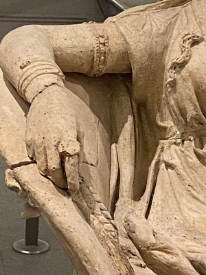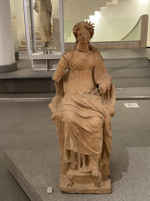 Statua di Demetra in argilla beige rosata lavorata a stecca in parte a matrice.