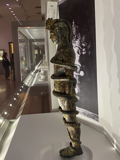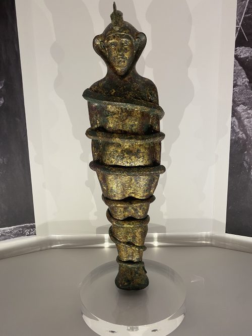 L’idoletto rappresenta un personaggio maschile avvolto dalle sette spire di un serpente, allusive alle sette sfere celesti, ed identificato con l’egizio Osiride o il siriaco Adone, divinità che nascono e muoiono ogni anno, entrambe legate al ciclo delle stagioni.