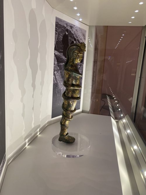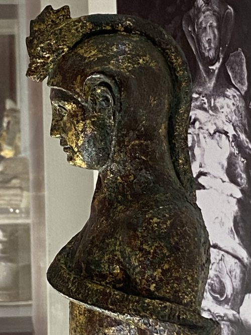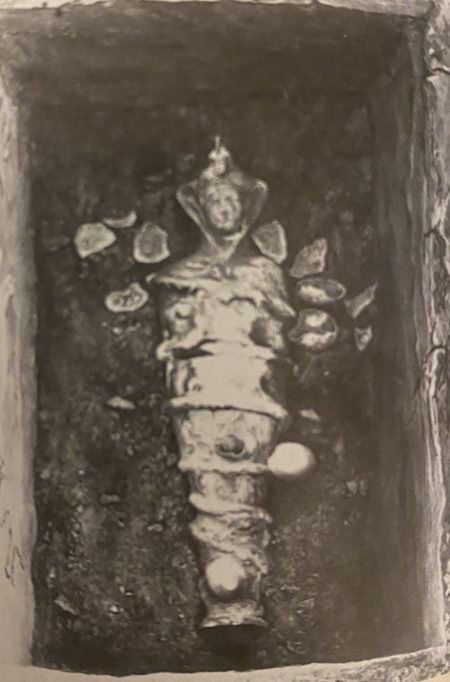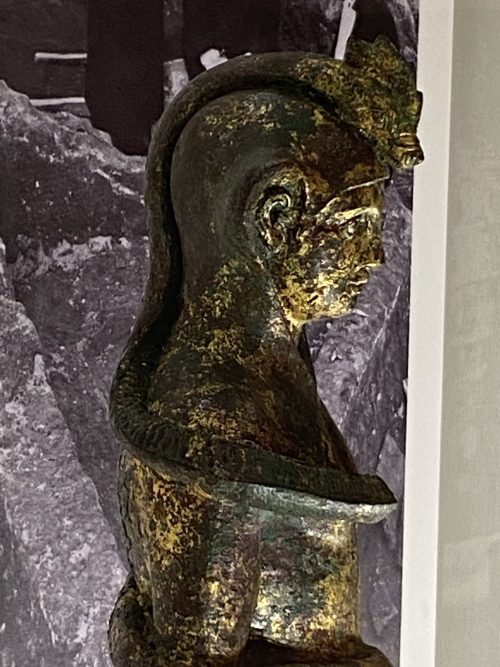 Ma i misteri non finiscono qui. Nella parte mistilinea del sacello, quella rivolta a est, vennero ritrovate una statua egiziana in basalto nero (proveniente dall’abside) e un’altra di Dioniso con il volto e le mani dorate. Venne rinvenuto, inoltre, un’idoletto bronzeo deposto, adagiato sul dorso, all’interno di un altare triangolare. Un giovane imbalsamato entro una stretta guaina e costretto entro le sette spire di un serpente che poggia la sua testa sul capo della statuetta. Al momento della scoperta tra le spire furono rinvenute sette uova in una disposizione simbolica. Un ritrovamento sconcertante che appassionò non poco gli studiosi nella ricerca dell’identità e del ruolo di quell’idolo singolare. Non è chiaro di chi si tratta. Certamente è una deità dai connotati egizio-siriaci, un dio solare sincretizzato che muore e rinasce. Che sia Simios o Adone o, piuttosto, Osiride o Dioniso, rappresenta le istanze di un culto misterico a carattere salvifico.