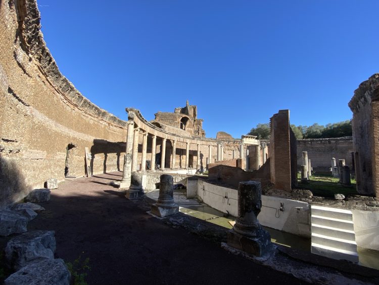 Ad una delle estremità del Pecile si apre la Sala dei Filosofi e da questa si passa ad un articolato edificio nel cui centro è un canale circolare che circonda una isoletta. Sull’isola Adriano sostava a meditare e per non essere disturbato, ritirava i ponti mobili che ne consentivano l’accesso.