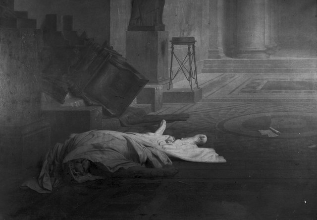 Cesare, afferrato il braccio di Casca, lo colpì con il suo stilo, poi tentò di buttarsi in avanti, ma fu fermato da un’altra ferita. Quando si accorse che lo aggredivano da tutte le parti con i pugnali nelle mani, si avvolse la toga attorno al capo e con la sinistra ne fece scivolare l’orlo fino alle ginocchia, per morire più decorosamente, coperta anche la parte inferiore del corpo.