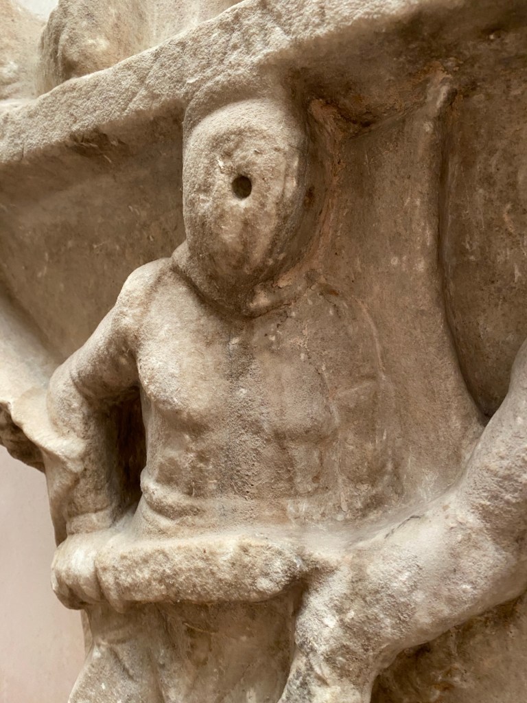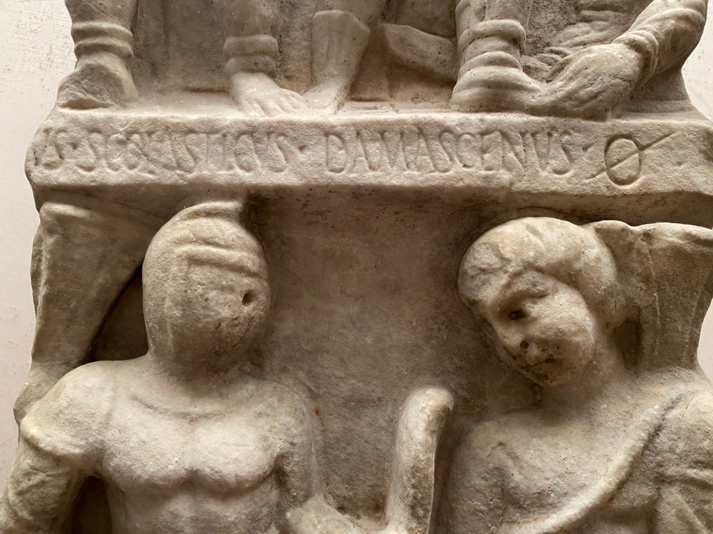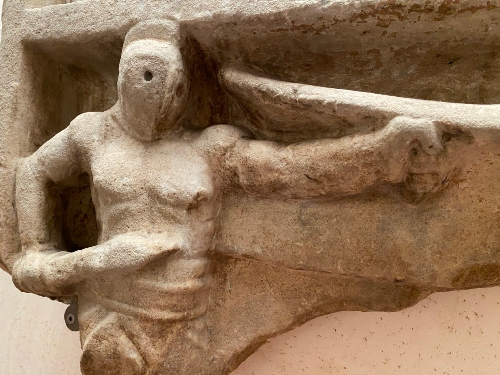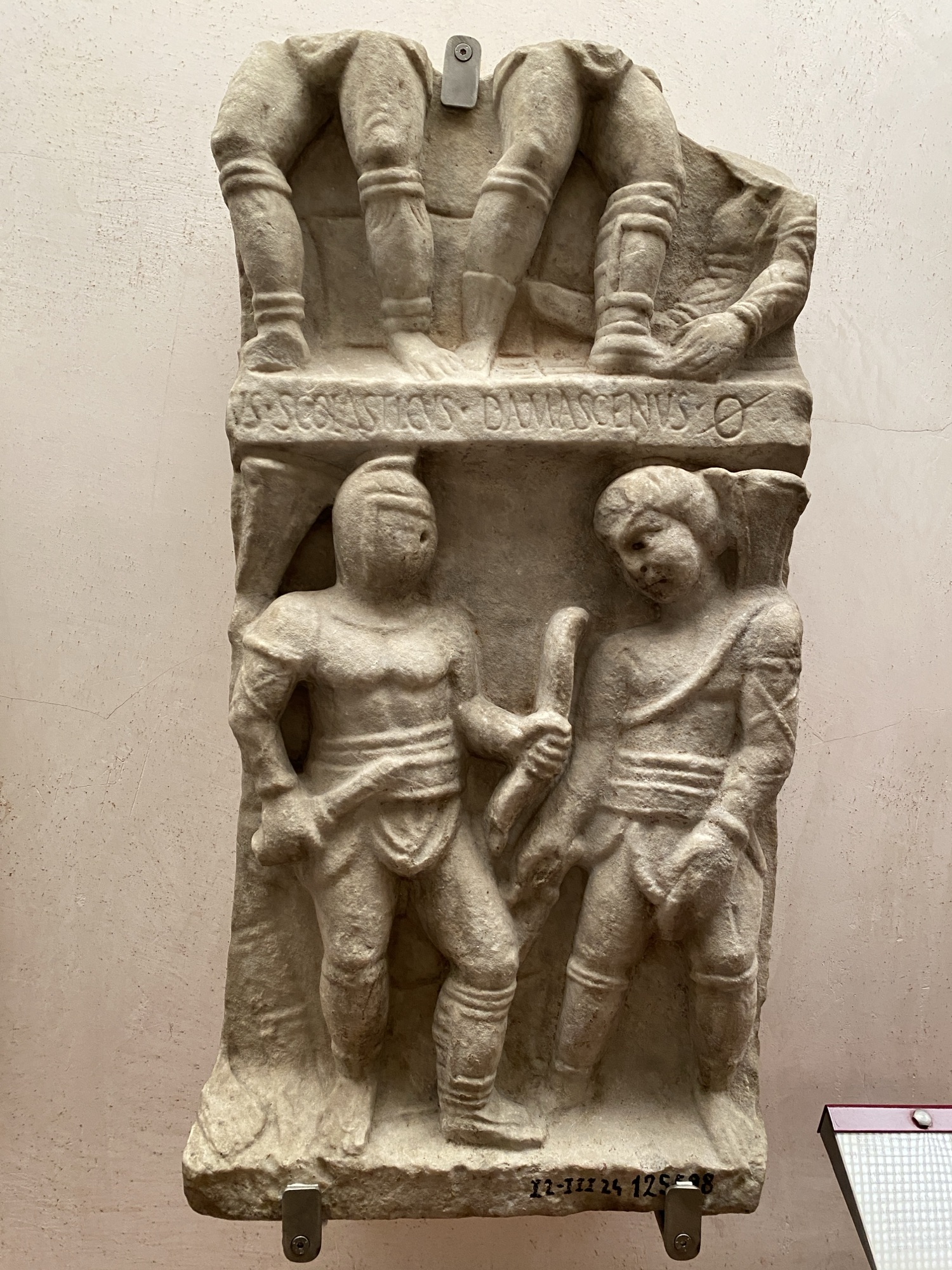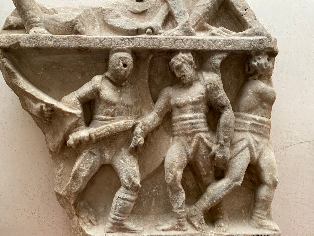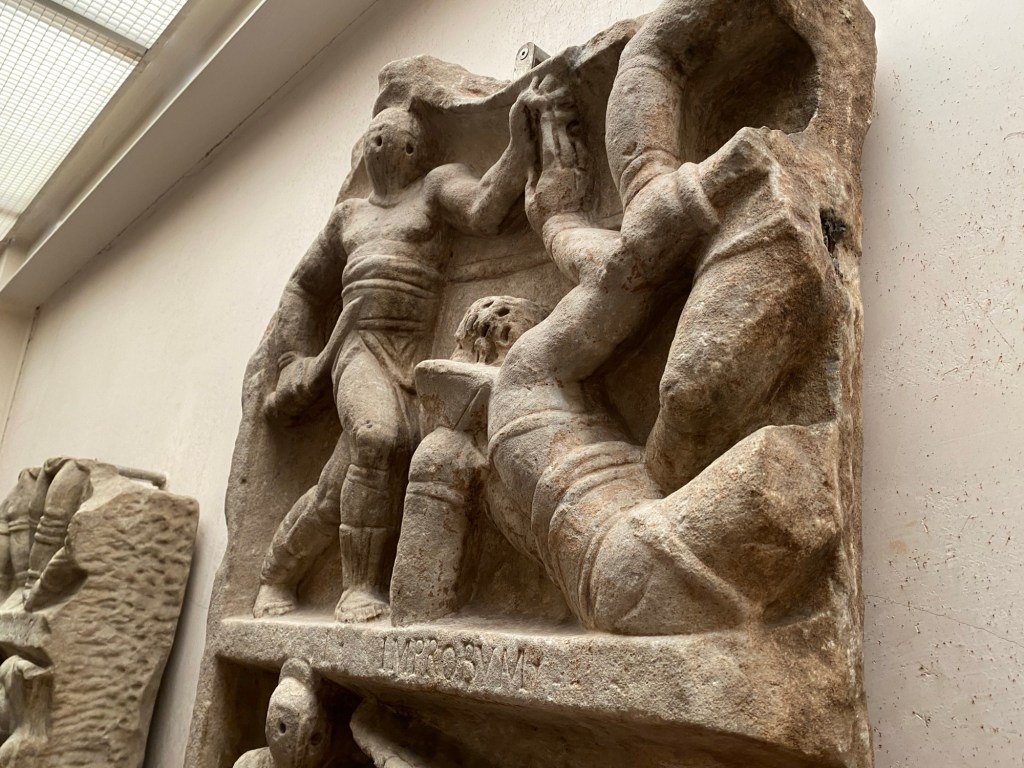Frammenti di un rilievo commemorativo delle imprese di un ignoto gladiatore (contraretiarius), raffigurato in diversi combattimenti (pugnae) con i suoi avversari retiari (gladiatori muniti di rete e tridente). Le iscrizioni indicano il numero dei combattimenti vinti (I, XI, XII) e il nome dei gladiatori sconfitti: Improbo, Panterisco e Ilaro.