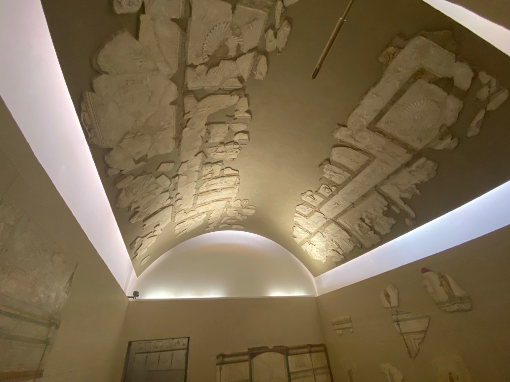 La volta a botte, decorata a stucco, presenta raffigurazioni di paesaggi idillico-sacrali e scene mitologiche, tra le quali Fetonte che chiede al dio Apollo, suo padre, di poter guidare il carro del Sole. Altri riquadri presentano statue di Zeus, una probabile effigie di Augusto novus Mercurius, dischi solari, vittorie alate e figure grottesche, eseguite a bassissimo rilievo con l’eleganza e la precisione di opere di oreficeria.