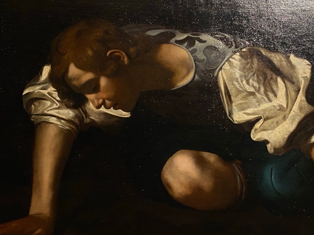 Il formato verticale della tela permette a Caravaggio di creare un’immagine quasi perfettamente doppia. Narciso, giovane elegante con un corpetto decorato, larghe maniche a sbuffo e pantaloni verde smeraldo, inginocchiato si protende verso l’acqua. Le sue braccia piegate ad angolo e riflesse seguono l’andamento della tela, e dal suo profilo si coglie l’espressione anelante.