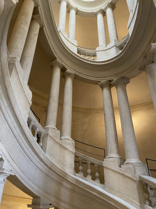 Il modello di riferimento potrebbe essere la scala ellittica dell’architetto Ottaviano Mascherino, molto apprezzato dal Borromini, realizzata nel palazzo del Quirinale (1583-1585). L’interpretazione borrominiana sembra preludere a soluzioni successive in cui è variamente riproposto l’avvitamento delle cornici e delle balaustre intorno a un perno centrale, con andamento ascendente ininterrotto, anche in corrispondenza dei pianerottoli.