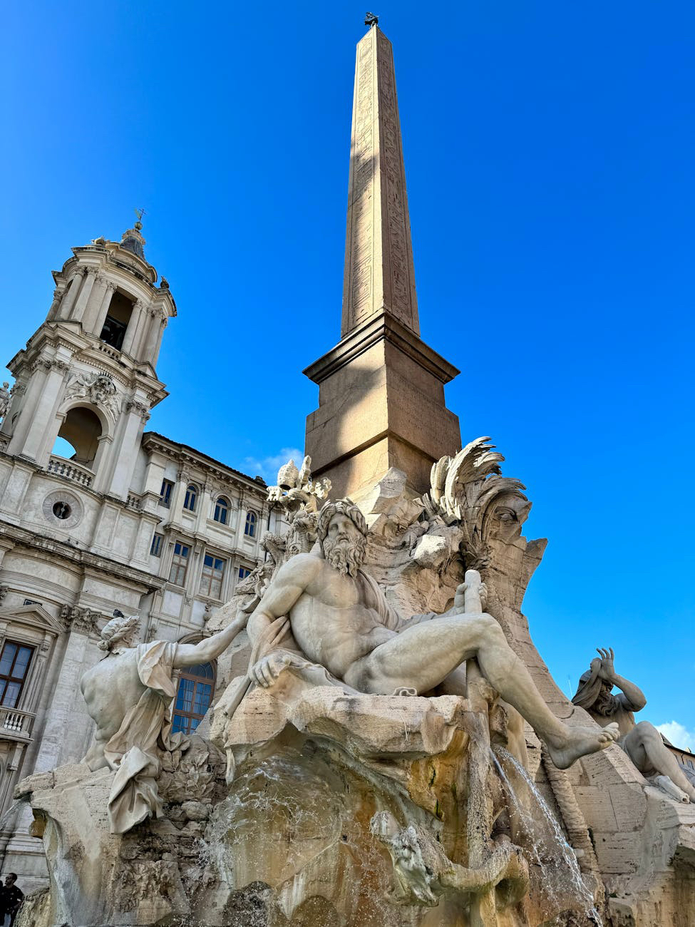 La fontana diviene il fulcro della piazza dei Pamphilj, è un centrotavola monumentale che non ne disturba l’unità visiva, perché il piccolo obelisco, innalzato su un alto plinto, insiste su una grande apertura che svuota la roccia, sfidando le leggi della statica e rivelando al mondo le capacità architettoniche di Bernini, messe in dubbio l’anno precedente con la demolizione del campanile. Domenico Bernini racconta che il padre volle togliersi la soddisfazione di prendere in giro “i più idioti o i men prattici” che credevano di “haver veduta tremar la guglia”: l’artista, che era anche autore, regista e attore di numerose commedie, organizzò una divertente messa in scena, nella quale si finse preoccupato per il rischio di un imminente crollo dell’obelisco, che decise allora di fissare con “quattro deboli spaghi” alle case circostanti, prima di andar via compiaciuto e rassicurato.