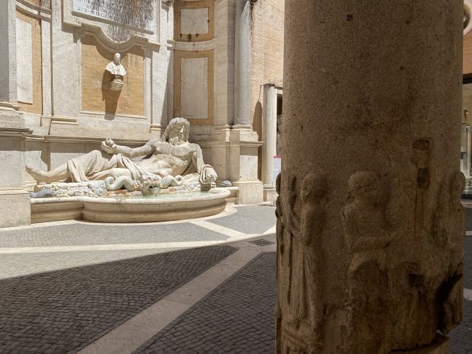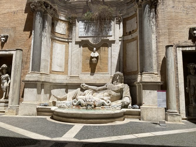 Con la costruzione del Palazzo Nuovo la Fontana del Marforio venne a trovarsi nel cortile del più recente tra i palazzi capitolini (1644). La successiva trasformazione di questo edificio nel Museo Capitolino (1733), comportò un nuovo allestimento della fontana e del prospetto architettonico, affidato all’architetto Filippo Barigioni. In questa occasione il Marforio venne sottoposto ad un nuovo intervento di restauro, eseguito dallo scultore romano Carlo Antonio Napolioni.