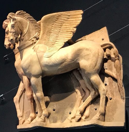 I “cavalli alati” di Tarquinia sono opera di un artigiano etrusco che nel plasmarli – nei decenni iniziali del IV sec a.C. – mostra una perfetta conoscenza della scultura greca di età classica ma resta nel contempo profondamente legato alla tradizione locale come rivelano la sproporzione volumetrica dei colli e delle teste rispetto al resto dei corpi esili e allungati, la voluta accentuazione delle annotazioni anatomiche, il gusto decorativo dei monili etc.