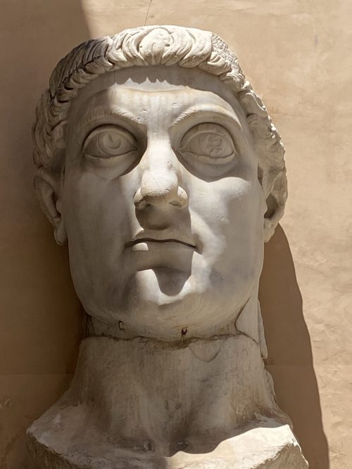 Nel 312 d.C., dopo la vittoria su Massenzio al Ponte Milvio, Costantino diventa il padrone assoluto della parte occidentale dell’impero e di Roma e agli anni iniziali del suo regno risalirebbe la realizzazione del Colosso, che, nella sua fissità ieratica, costituisce una delle manifestazioni piú impressionanti dell’arte costantiniana.