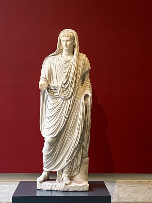 La statua dell’imperatore Augusto, risalente al I secolo d.C., è rappresentato in veste di Pontifex Maximus, simbolo di potere e tradizione, rinvenuta nel 1910. Oggi è esposta al Museo Nazionale Romano.