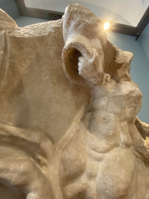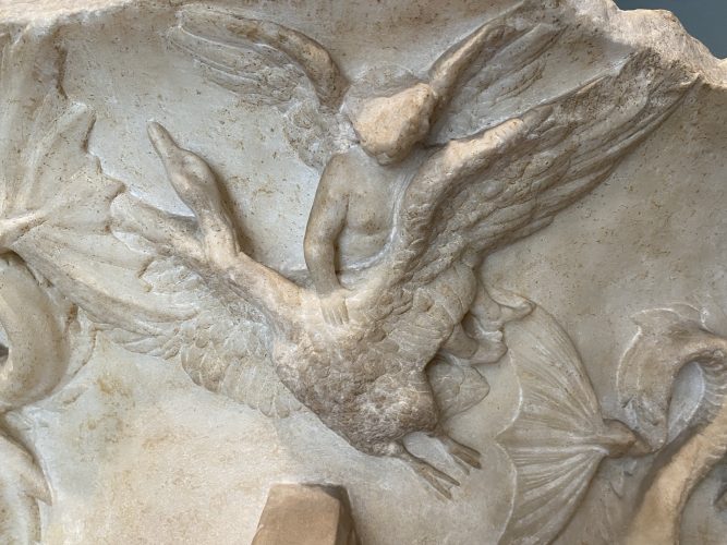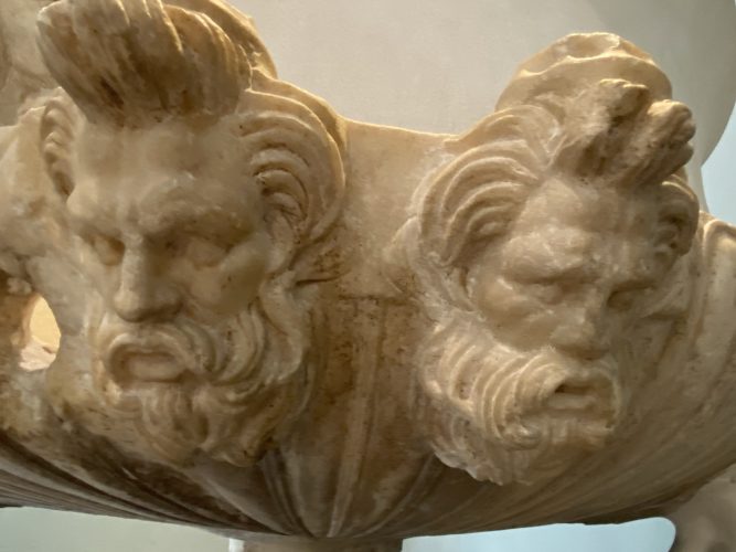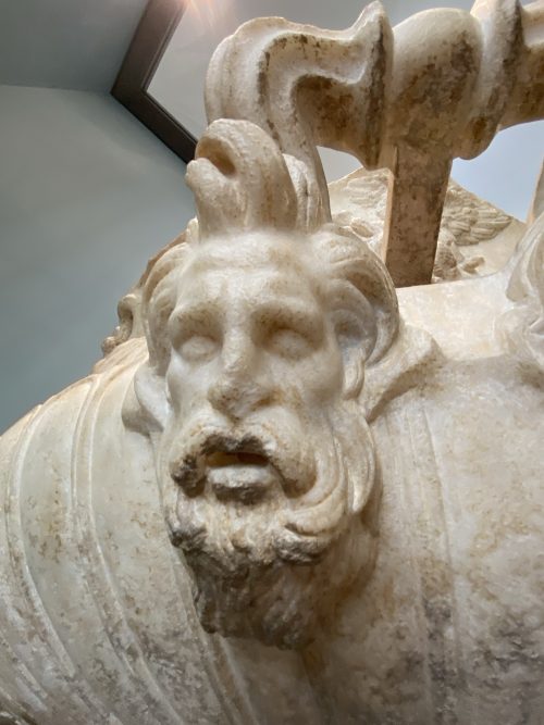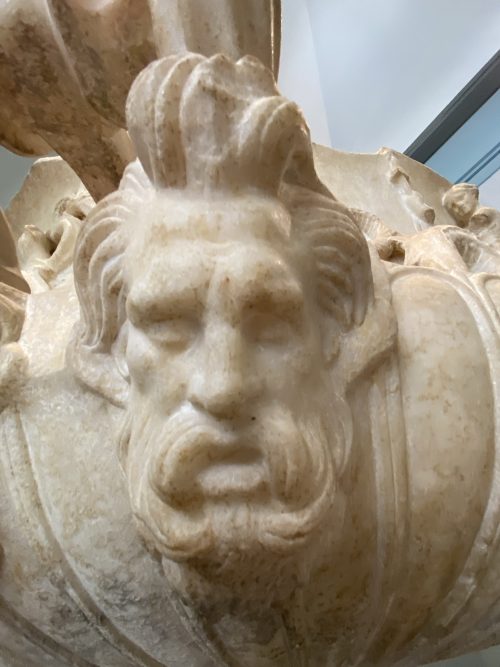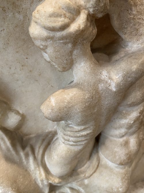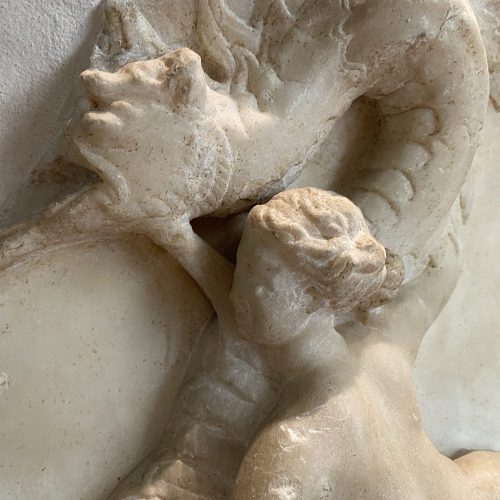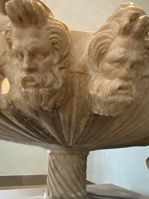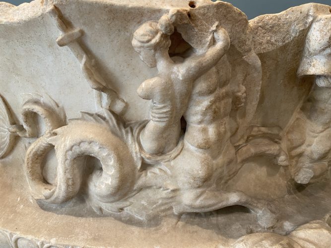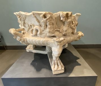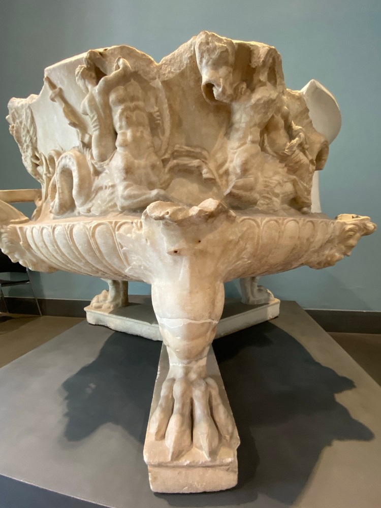 Tra i capolavori più affascinanti conservati a Palazzo Massimo, spicca una straordinaria tazza marmorea decorata con un fregio marino di rara eleganza. Rinvenuta nell’area del lungotevere in Sassia, probabilmente nei pressi degli antichi Horti di Agrippina, questa opera d’arte unisce raffinatezza tecnica, profondità mitologica e valore storico. Il fregio scolpito raffigura un corteo marino animato da Nereidi e tritoni, culminante nella scena della consegna delle armi ad Achille, episodio centrale dell’Iliade di Omero. L’opera, realizzata in marmo pentelico, è un esempio eccellente di scultura decorativa romana influenzata dal tardo ellenismo, e testimonia la cultura colta e simbolica delle élite imperiali.