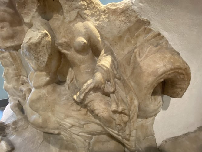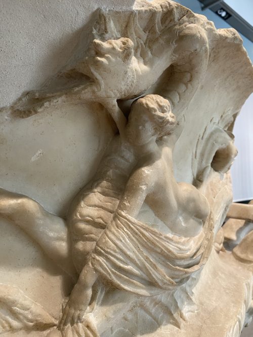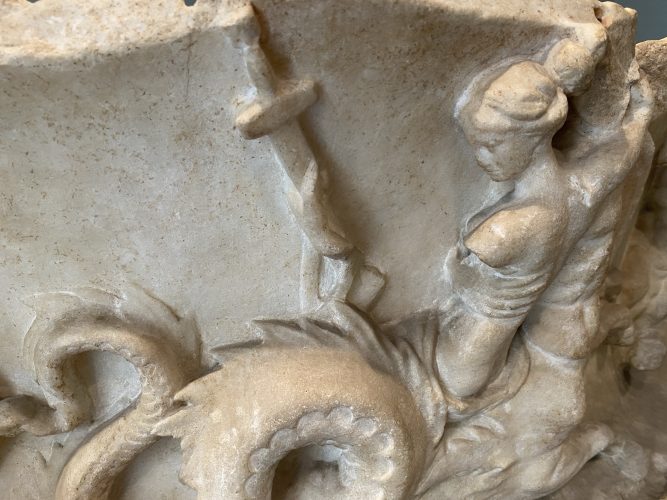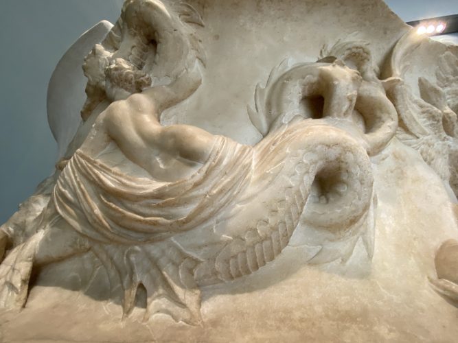 Il fregio scolpito in altorilievo raffigura un corteo marino (thiasos) di rara eleganza. Le Nereidi, ninfe del mare, si muovono con linee sinuose e leggere, trasportate da tritoni dai corpi atletici e scolpiti con precisione anatomica. Le figure sembrano danzare sulle onde.