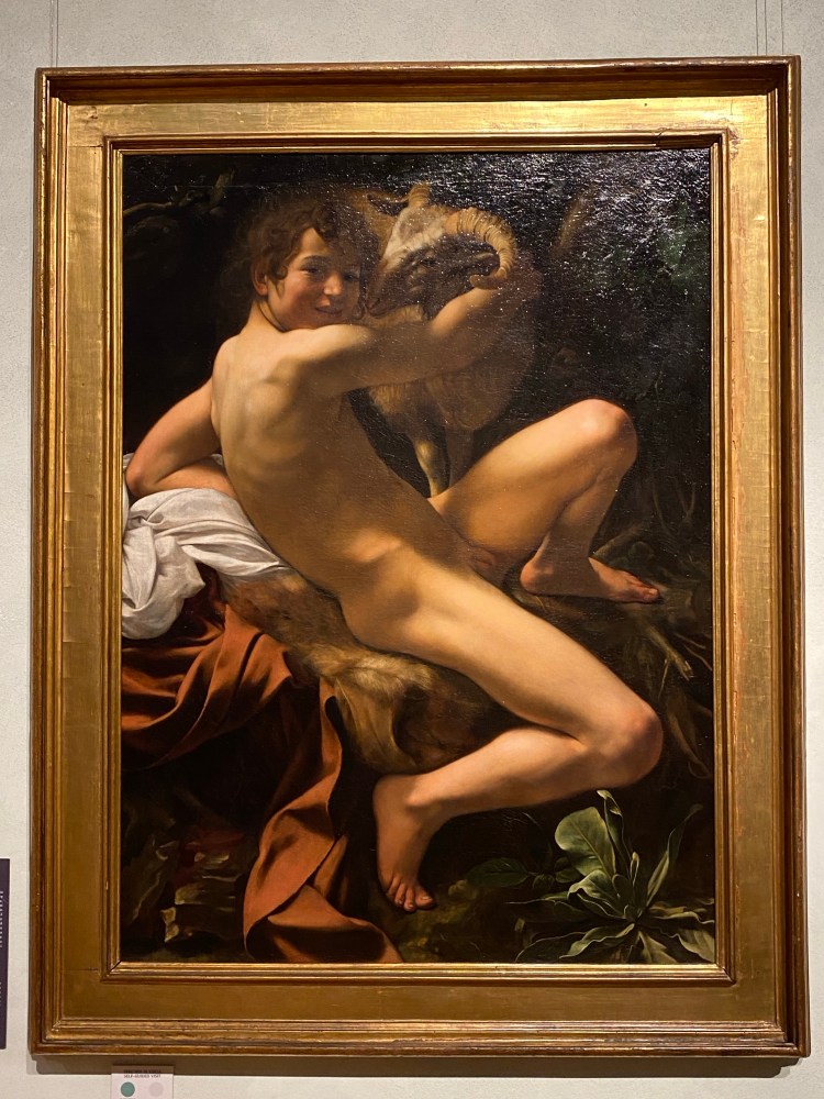 Il dipinto di Caravaggio rappresenta un giovane nudo, abbracciando un ariete, che incarna un San Giovanni Battista umano e divino. L’opera è rivoluzionaria per l’uso del chiaroscuro e il realismo, esprimendo gioia e vulnerabilità.