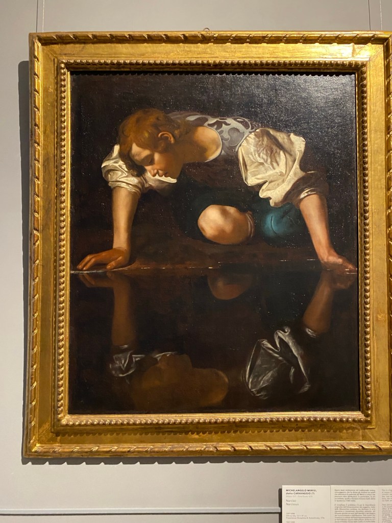 Il dipinto “Narciso” di Caravaggio, attribuito da Roberto Longhi, rappresenta un’interazione tra mitologia e modernità, esprimendo un’adorazione di Narciso per la propria immagine. La composizione verticale e le influenze stilistiche lombarde evidenziano la bellezza e l’anelito del giovane, immerso in un contesto classico e quotidiano romano.