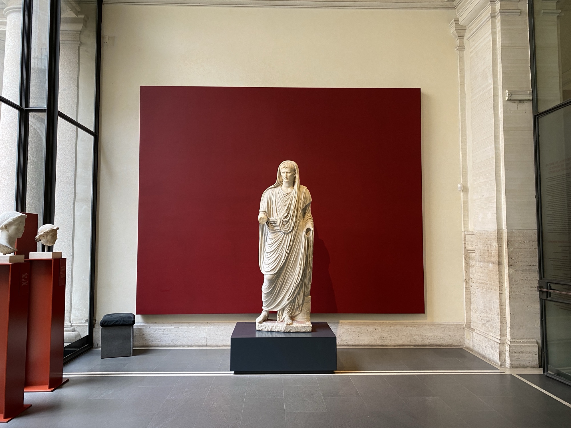 ROMA- MUSEO NAZIONALE ROMANO – PALAZZO MASSIMO. La Domus di Agrippa presenta decorazioni parietali straordinarie con colonne e figure femminili che ricordano le Cariatidi, insieme a affreschi di nature morte e battaglie navali.
