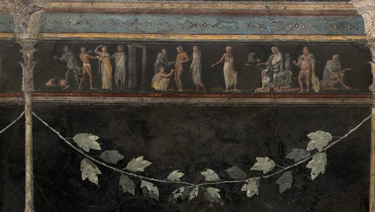 ROMA, PALAZZO MASSIMO -La sala da pranzo della casa Farnesina presenta decorazioni eleganti e un ambiente confortevole per l’inverno, con pannelli neri, mosaici, e affreschi raffiguranti paesaggi e storie popolari.